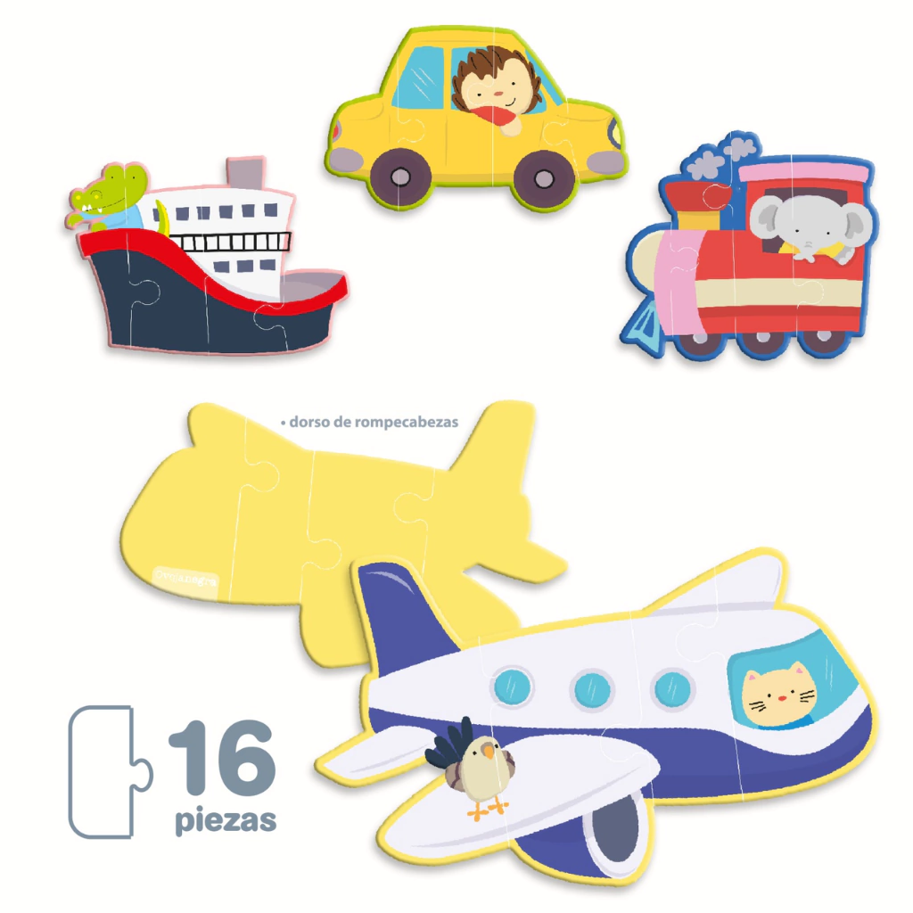 ¿Este juego creativo incluye 4 rompecabezas de cuatro piezas de distintos transportes. Los diferentes colores de fondo en el reverso ayudan a separarlos.